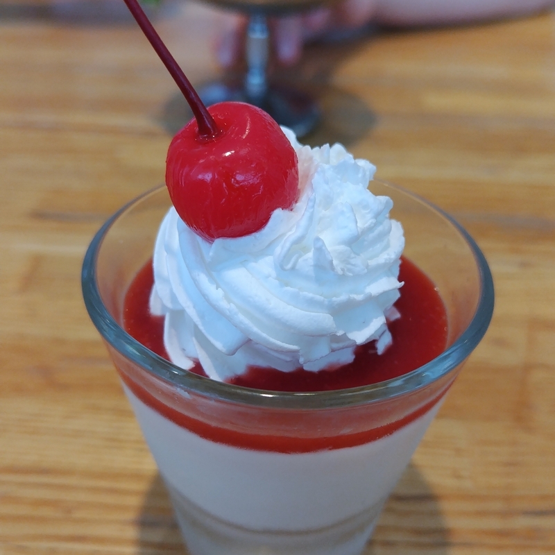 パステルのイートイン限定スイーツ、いちごのパンナコッタ。甘さがちょうどよくてスルッと食べられちゃいました。ランチセットに付けましたが、自分のパスタ+パンナコッタに加えて子どもが残したサラダと唐揚げとプリン半分も食べてフードファイト化しました。