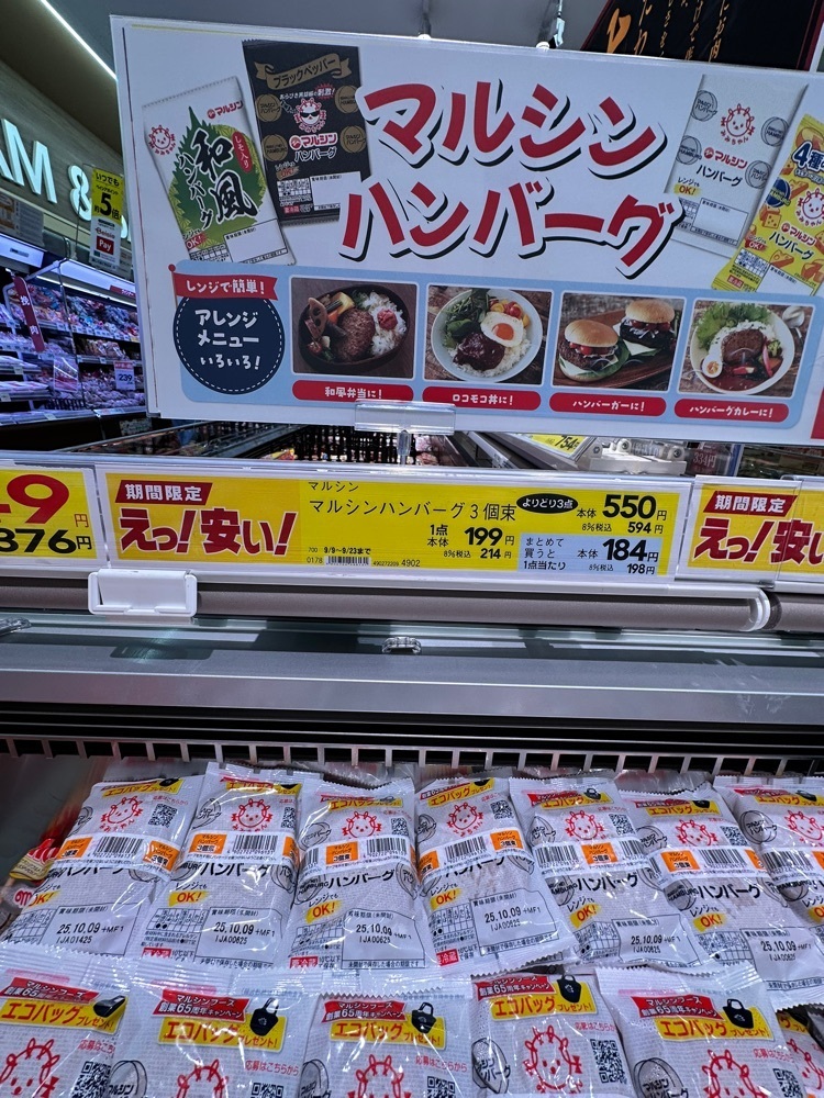 2025年9月15日(月) ⛅️1週間分の恒例の買い出しベイシアで見つけたお買い得品マルシンハンバーグ3個束×3種類よりどり3点で594円(税込)その中で選んだのは⚫︎ガーリックバター⚫︎ブラックペッパー⚫︎4種のチーズ入りの計9個賞味期限切れまでには食べれそうも有りません😩やっぱ残った物は超得意な冷凍保存で冷凍庫にインします👌#aumo#マルシンハンバーグ#冷凍保存