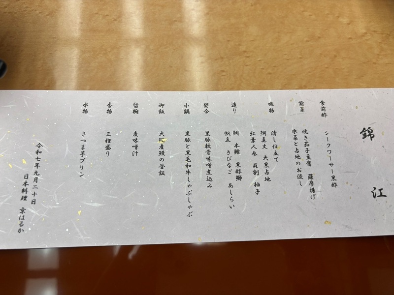 2025.9.20今回は隼人にある稲盛さんのホテル、京セラにお世話になります。初日のディナーは日本料理「京はるか」でいただきました。お造り、きびなごは久しぶり、酢味噌で美味しく。黒豚軟骨味噌煮込みは柔らかくて味がよくしみていて。黒毛和牛と黒豚しゃぶしゃぶは甘くて美味。コースに付け足した鹿児島黒豚とんかつはまたまた美味しい!カシスオレンジもいただきほろ酔いお腹いっぱいになってしまいました。天気が激変した1日でしたが、有意義な1日になりました。