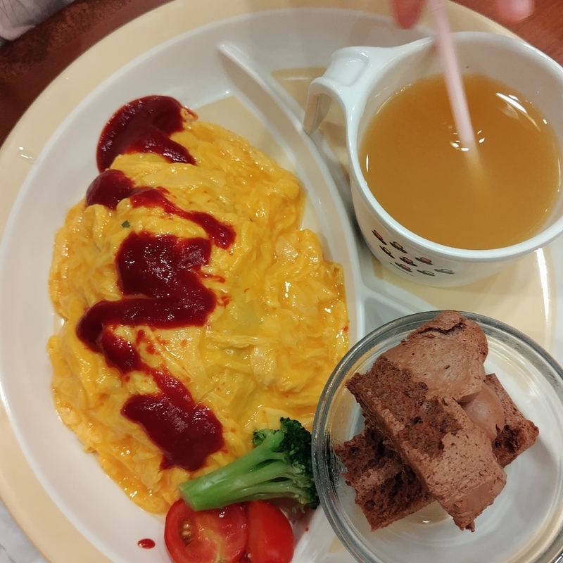ダッキーダックのお子さまランチ。オムライスは大人が食べても美味しく感じる、たまごのトロトロ感(半熟とかではなくちゃんと火がはいってる)が魅力!私の大好きなチョコレートケーキも少し付いてて、贅沢だなぁと思いました。おもちゃかぬりえがもらえます!
