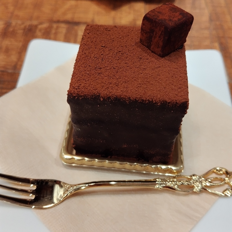 シルスマリアの石畳。ふわっとしているので、チョコレートケーキの重厚感が苦手な方も間違いなく楽しめます。上にのっている生チョコレートも幸福感を誘い…。チョコレート好きな方にはたまらないケーキです。甘さも控えめ。