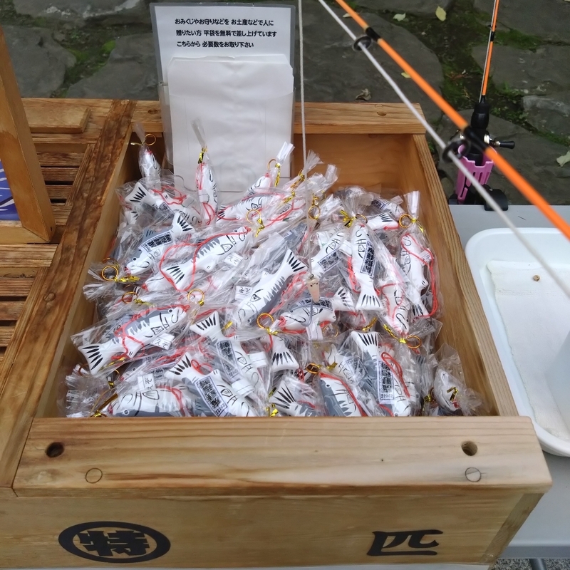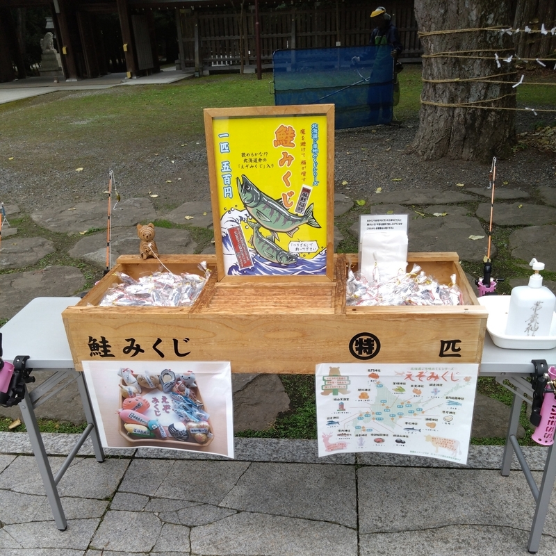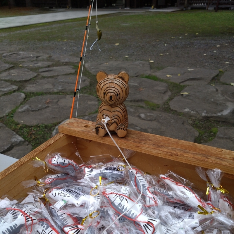 帯廣神社の「えぞみくじ」は鮭の張り子でオモチャの竿を使って釣って獲ります。まあ、手で獲ってもオッケーなんですけが。