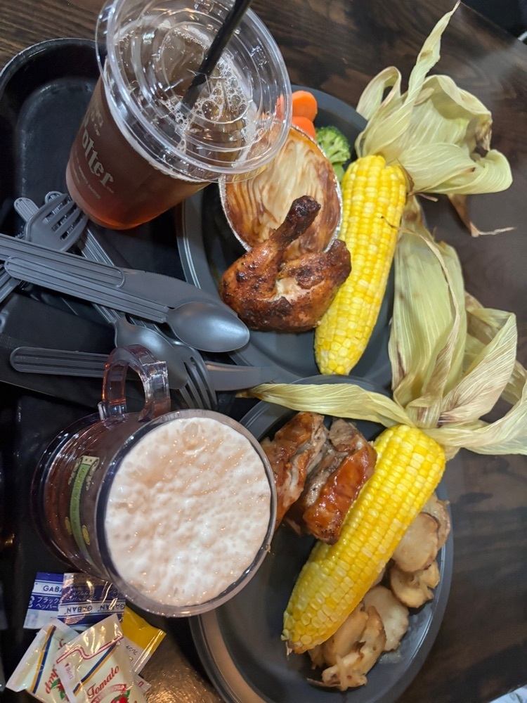 ハリーポッターの世界でバタービールや美味しい料理に舌鼓。とうもろこしでお腹いっぱいなった感😊バタービールのカップは洗って持って帰りました。