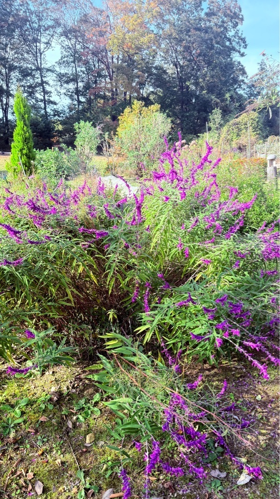 カフェのお庭に、マリーゴールドとアメジストセージが