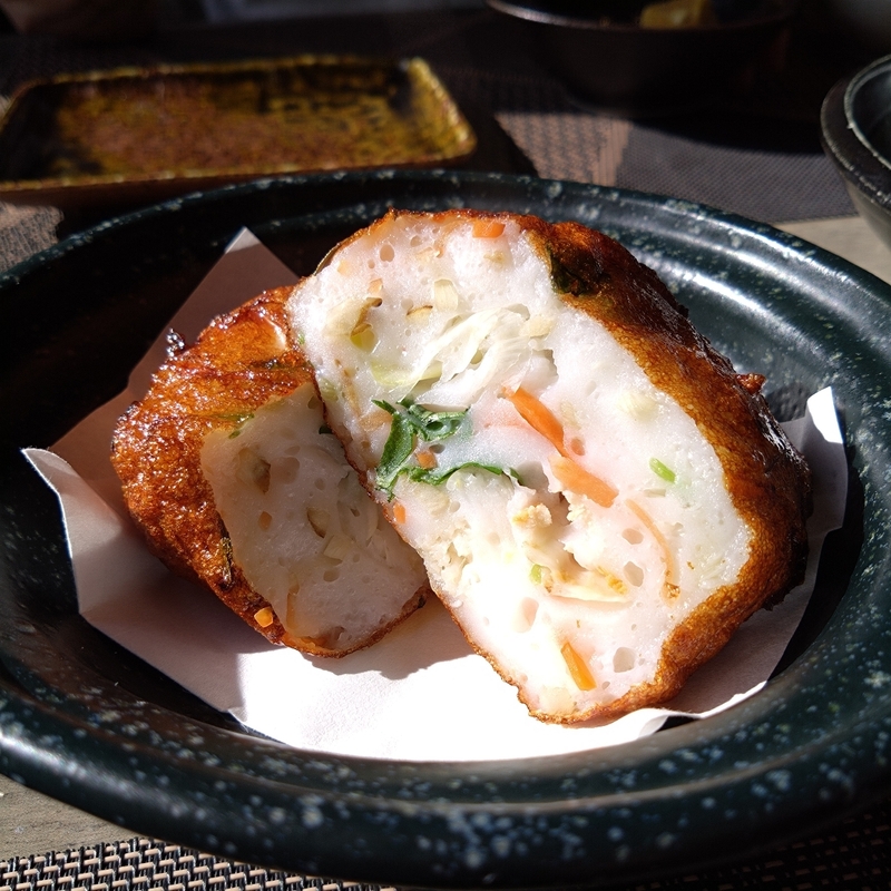 この海鮮さつま揚げ、外側がカリッとしていて中はフワッとしているだけじゃなく、海老などの海鮮と野菜がたくさん。その旨味と甘みも凝縮していて一口食べると幸せになる味です。