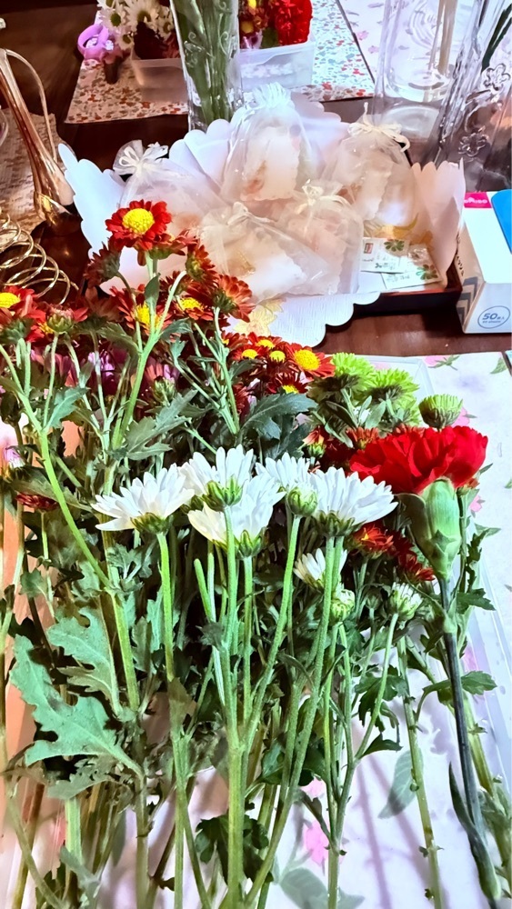クリスマスを意識して、赤と緑のピンポンマムを中心に
