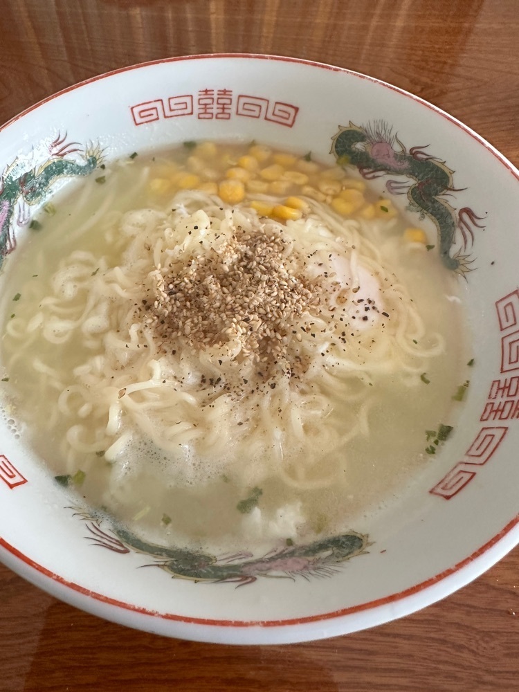 今日の塩ラーメンは玉子にコーンともやしを添えました。