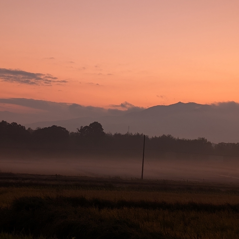 昨日の夕方の景色福井県から帰宅途中雨上がり、畑や田んぼに霧?モヤ?が全体的に掛かってて地球が5層に分かれて何か幻想的な雰囲気でした✨ 😄