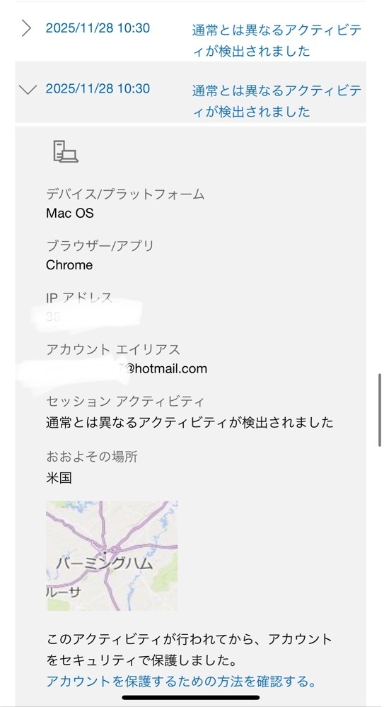 そういえば、数日前にhotmailに「通常とは異なるアクティビティが検出されました」と通知が来たのを思い出しました。