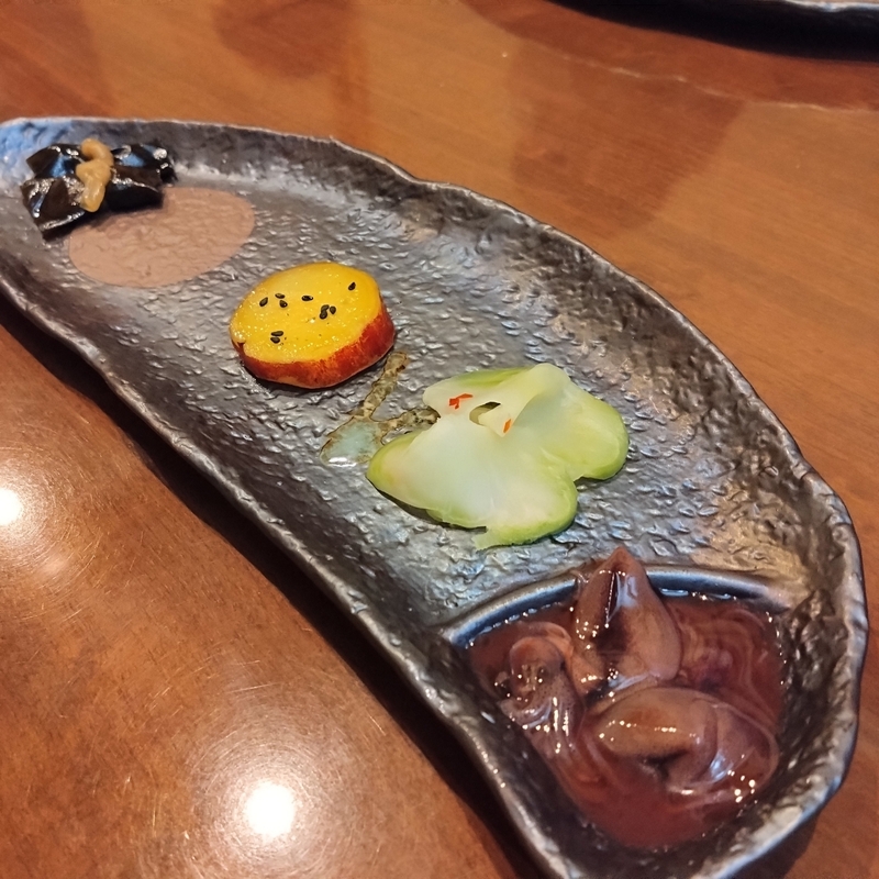 刺身4点盛りから始まり、握り寿司4貫、牡蠣と海老のホイル焼きや名前は忘れたけど鶏肉のやつ、海鮮茶碗蒸しにわんこうどんと柚子シャーベットで締め。