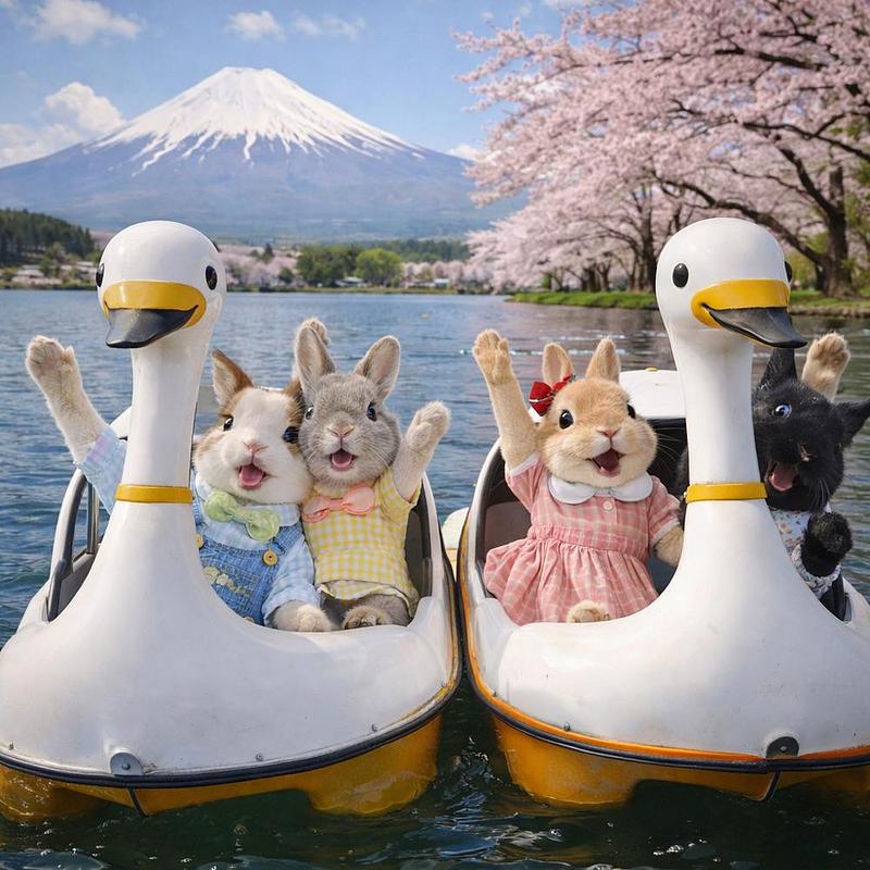 写真4枚目は富士山が見えるとこでスワンボート乗ってるの!あー楽しそうで可愛い!!❤️手の長さとかバグってるし黒うさは黒猫に見えるけど可愛い!!