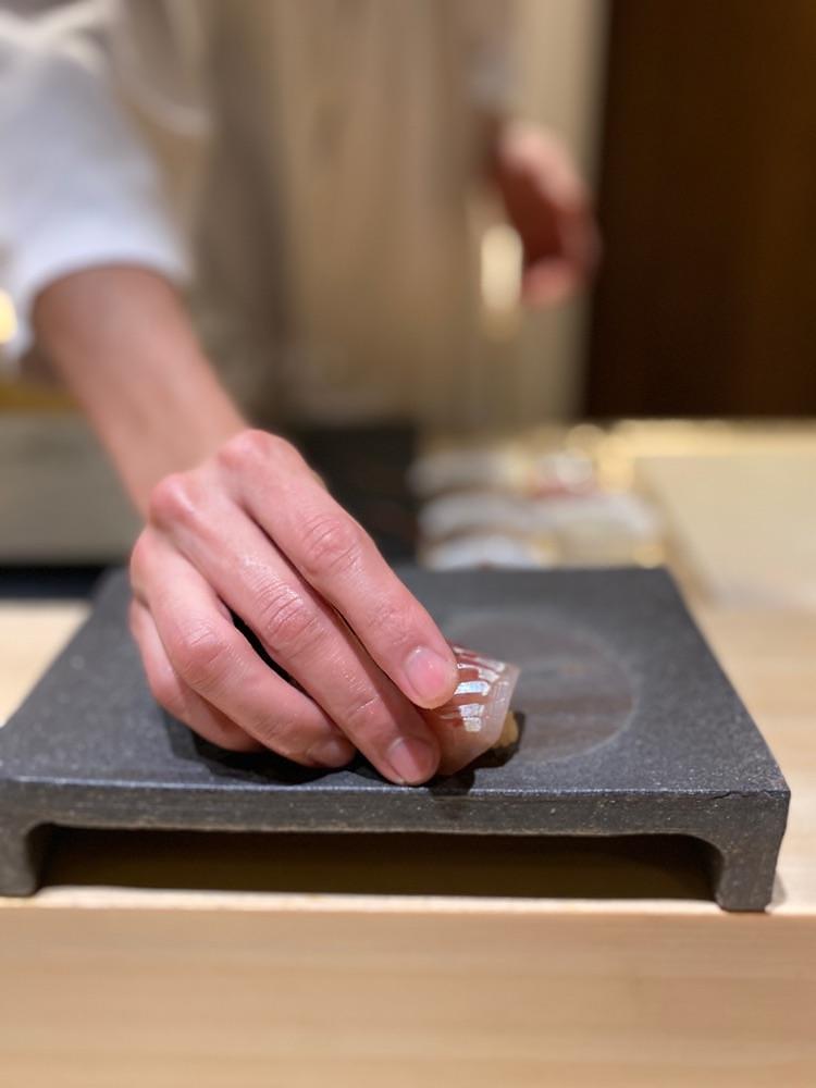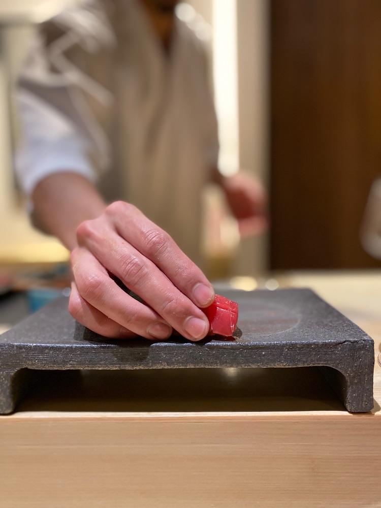 コースは一貫した流れの中で提供され、先ずは雲丹と鮪の脳天。名刺代わりにと手渡しで提供されるスタイルで、温かい鮪の脂が穏やかに広がります。